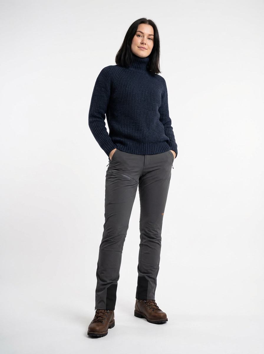 The fabric is a durable ply/elastin blend with four way stretch and perfect retention memory. While not waterproof, these pants are lightweight, durable, and very comfortable.