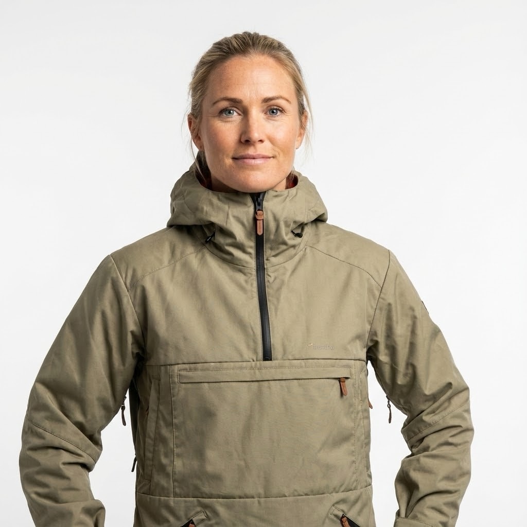 The anorak has a spacious hood with side and top adjustments. There are also adjustments at the waist and bottom. It is prepared for a fur 55-65cm collar.